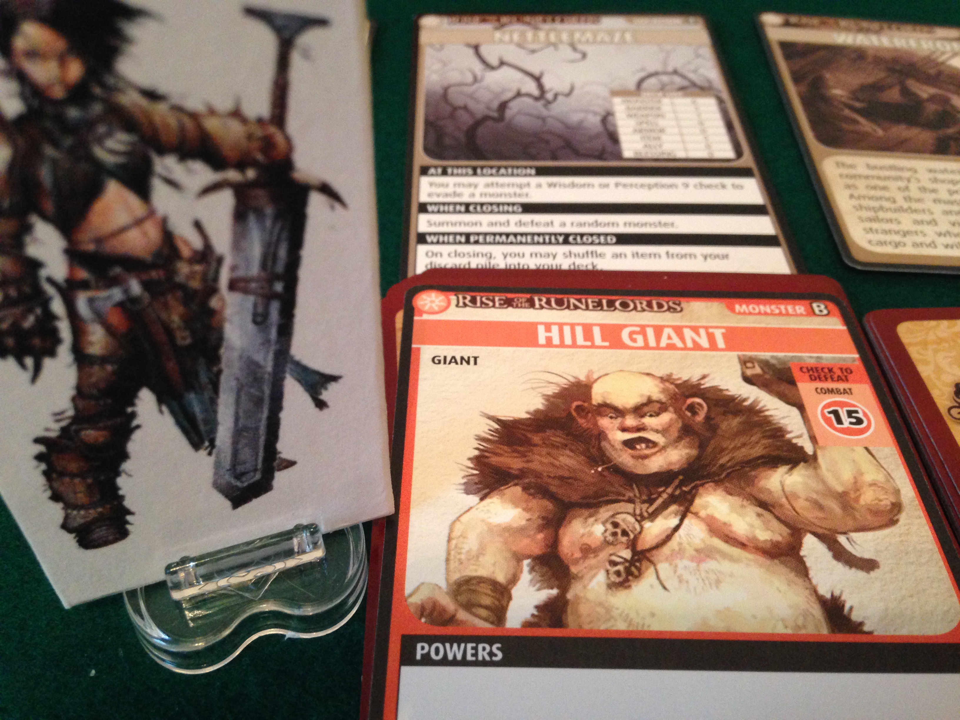 Suddenly, a Goblin Warrior runs wildly out of the undergrowth being chased by a Hill Giant. Amiri swings and the Goblin never knew what hit it. As the Goblin collapses in a heap, the Hill Giant trips over its body and Amiri smacks it over the head with her sword. The weapon splinters, but the Giant is dead.