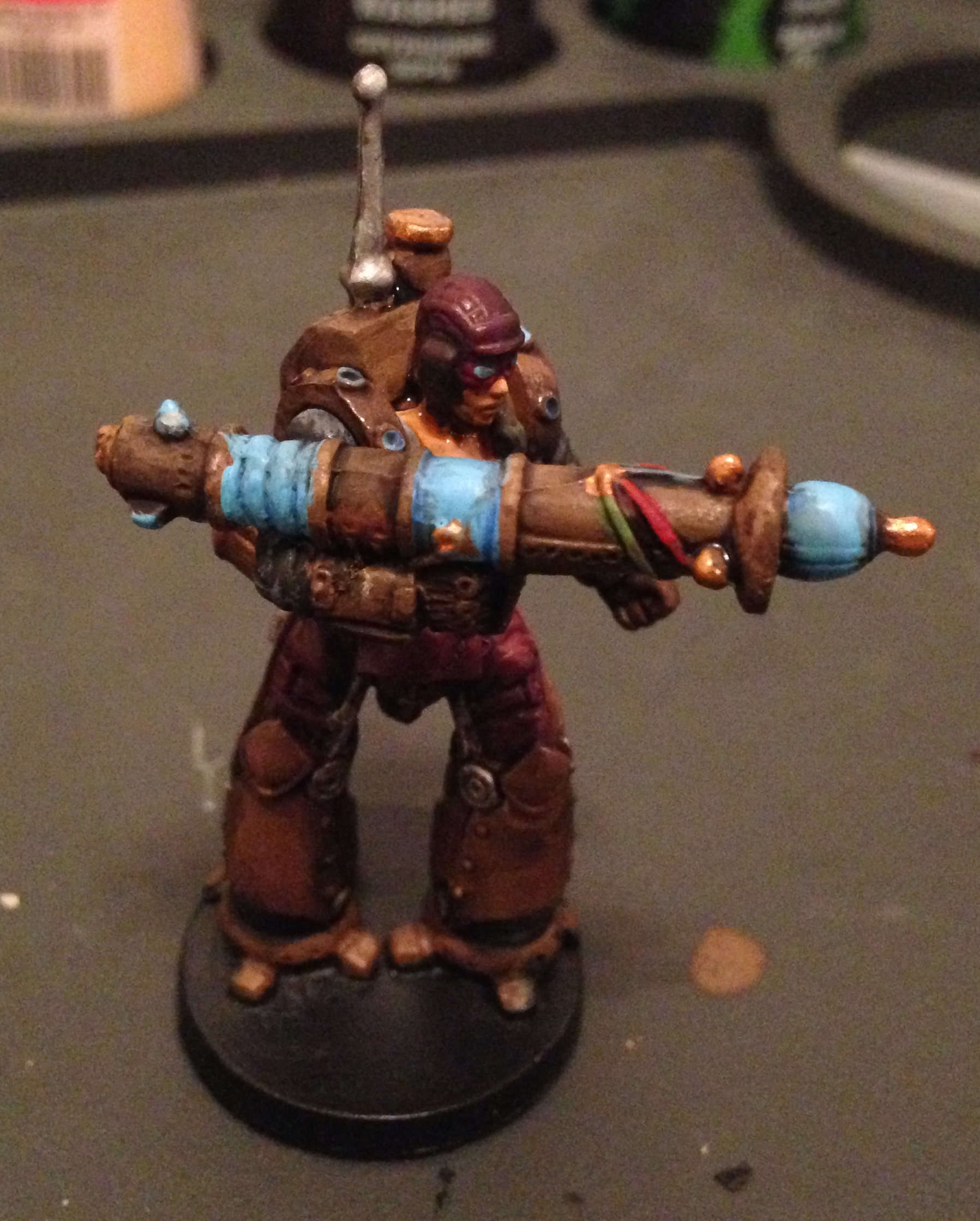 Next I added that shading. I used Gryphonne Sepia for her skin, and Nuln Oil for the suit and gun. The Nuln Oil is great for metallics.