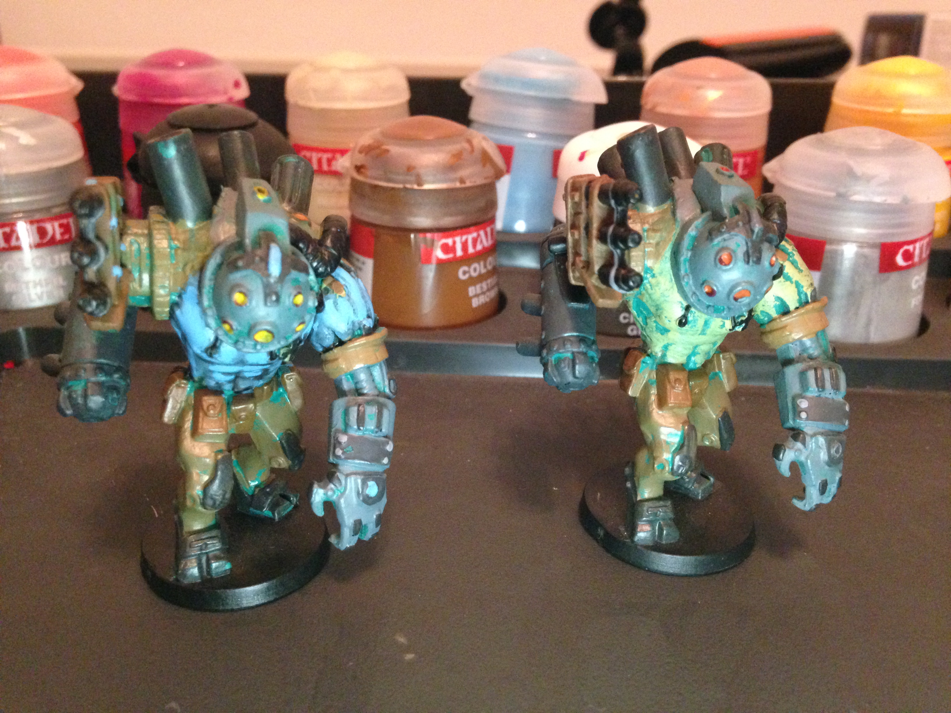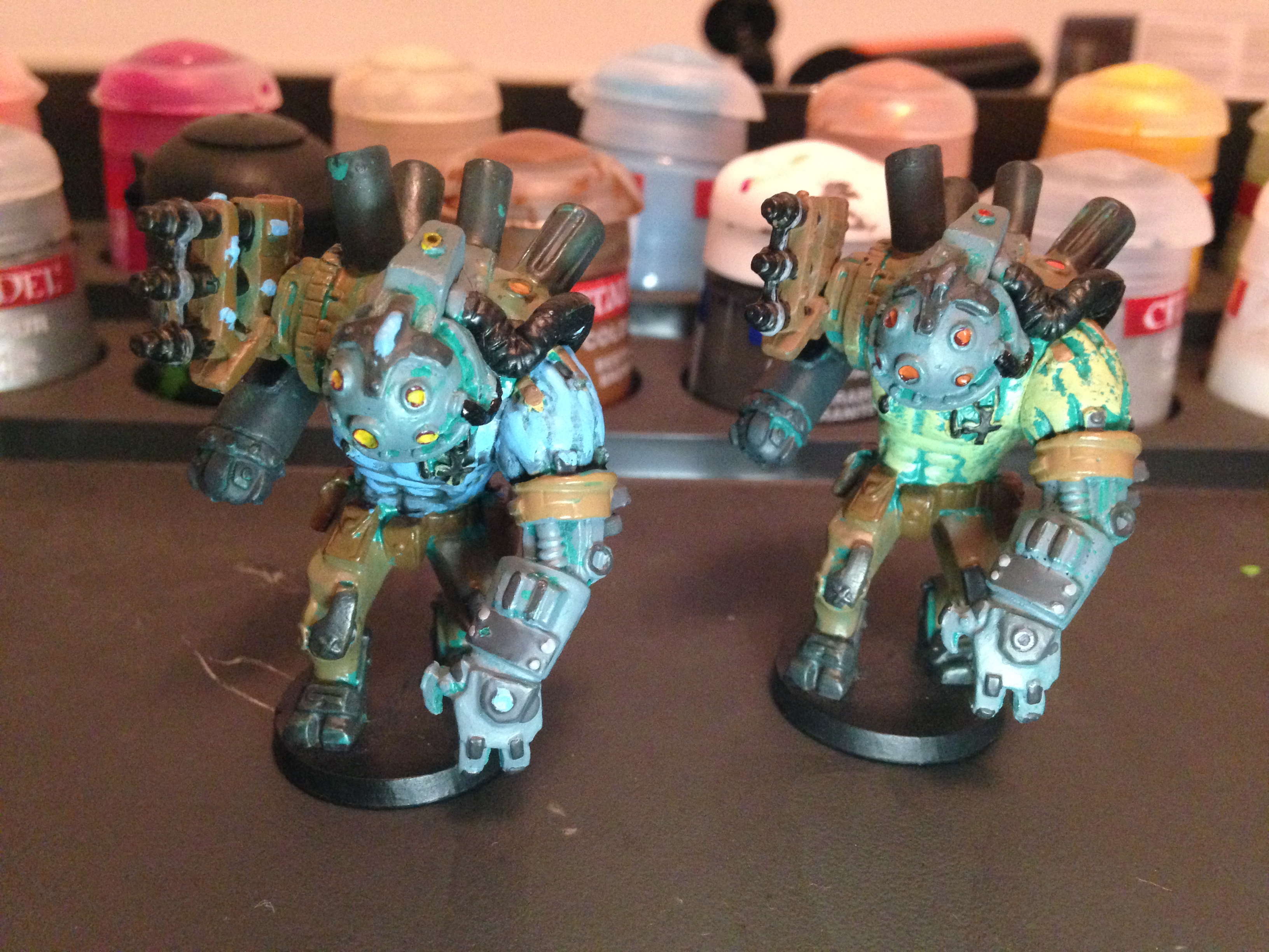 They should have the same general colour scheme, which is industrial and zombie-like (i.e. Frankenstein’s monster), so I made the second one blue-skinned, with yellow fusion glows.