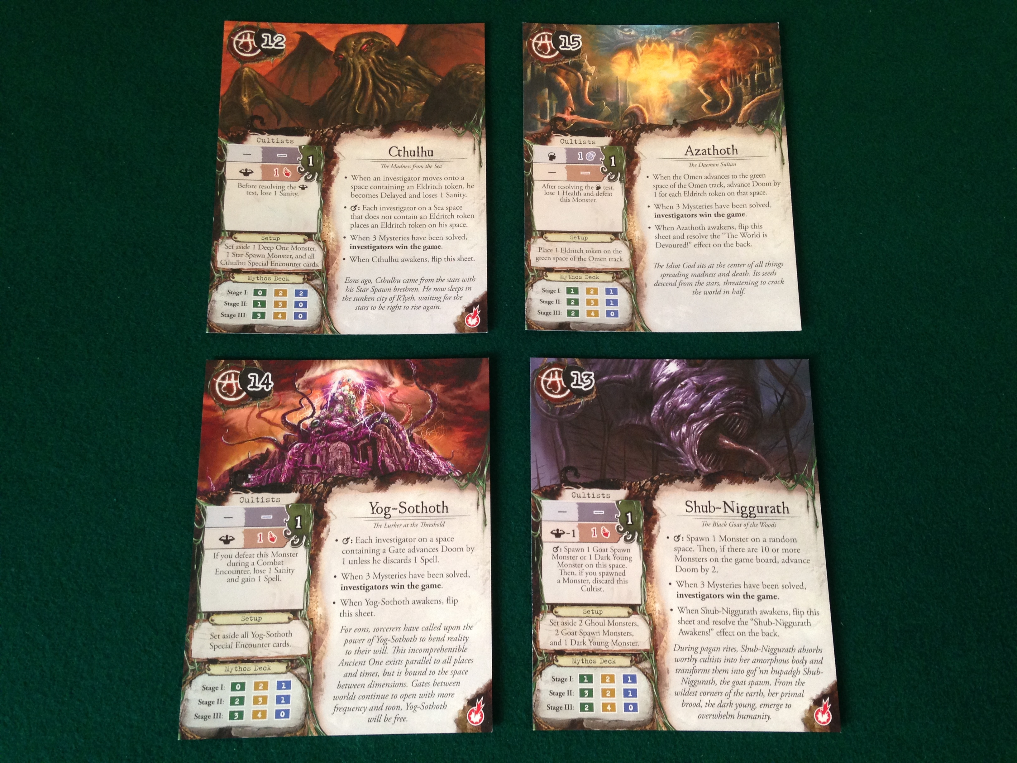 The investigators are up against one of the Great Old Ones, Cthulhu, Azathoth, Yog-Sothoth or Shub-Niggurath. The aim of the game is to solve the specific ‘mysteries’ for the Great Old One instead of just closing gates. This sounds more story-like.