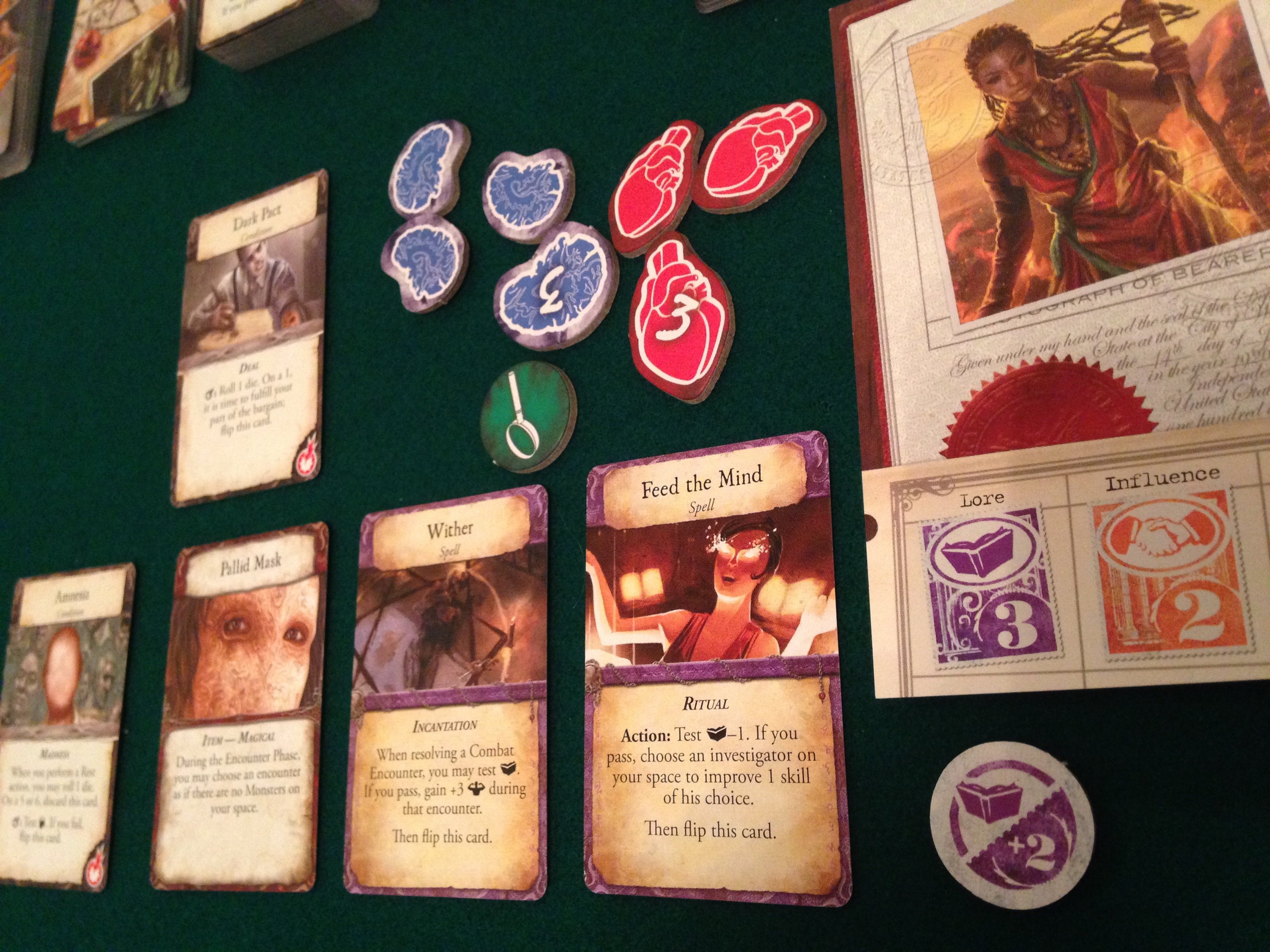 They got off to a good start, gaining lots of spells and equipment using bank loans and clearing the debts with influence. The first mystery was solved fairly quickly without the doom track dropping much.