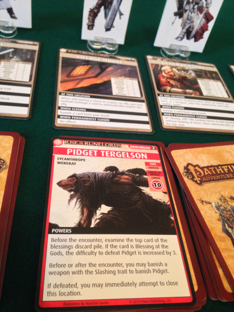 Amiri peeks through the rainy windows of the Village House. There is furtive movement inside. She smashes the window with her Mattock and leaps into the hallway. She surprises Pidget Tergelson the Wererat who is putting ornaments into a sack. He snarls and throws the sack at Amiri’s legs but she leaps and smashes her warhammer into his head. The ornaments roll around the floor. He hadn’t touched the silverware.