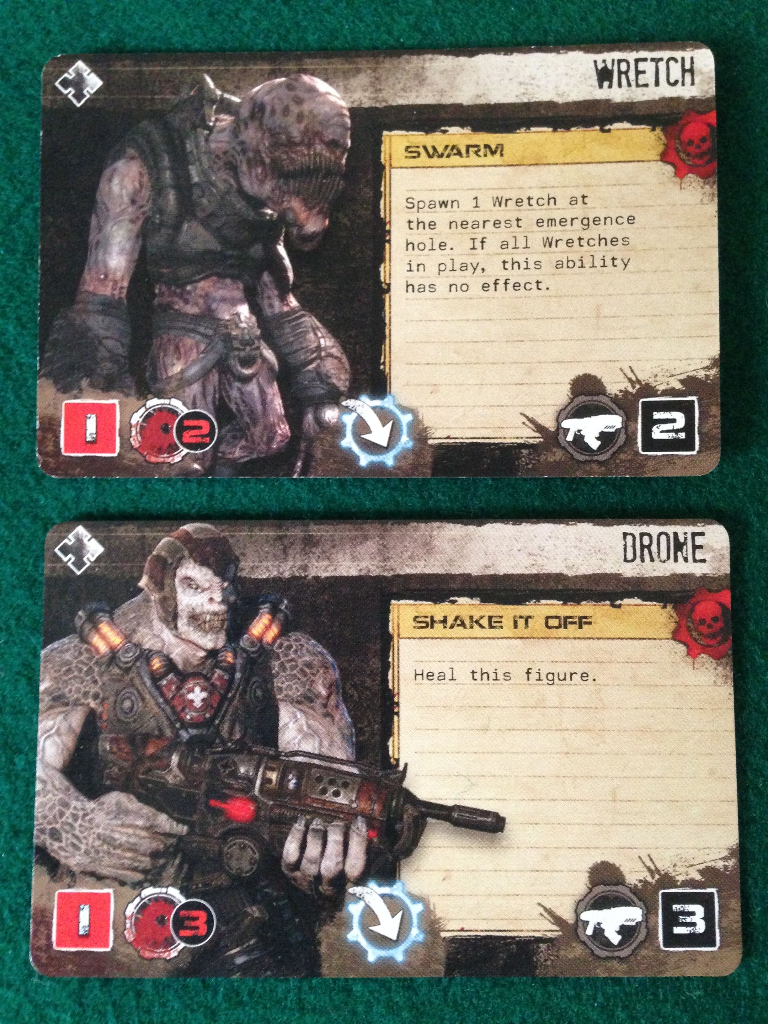 The wretch and drone locust cards show their defence (in red square) and health (the red number next to it).