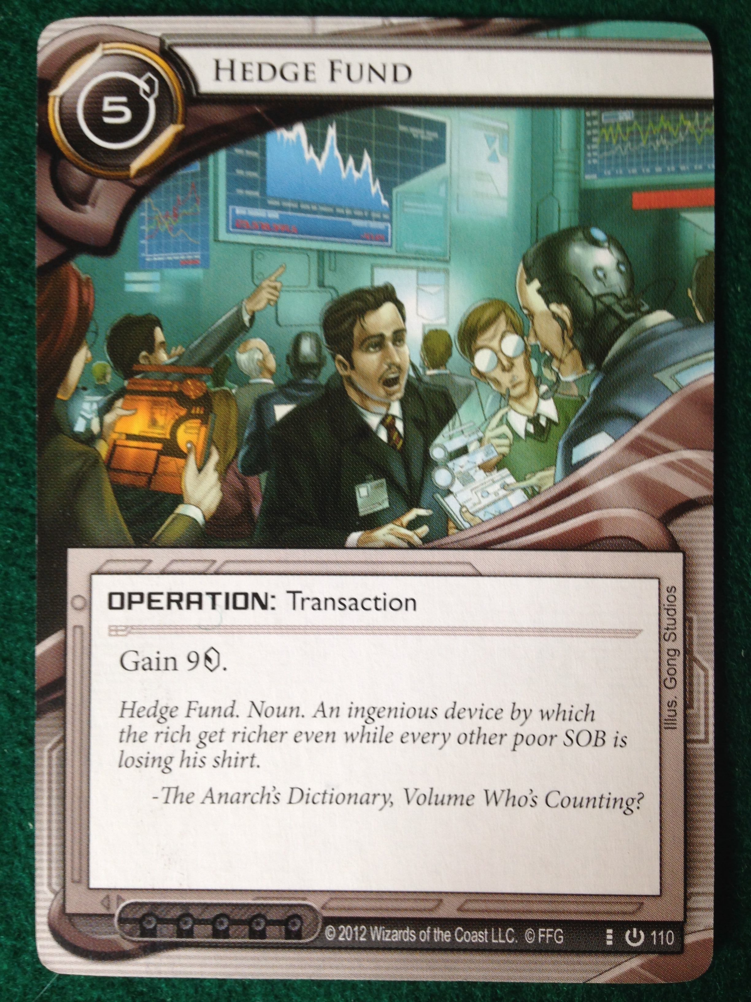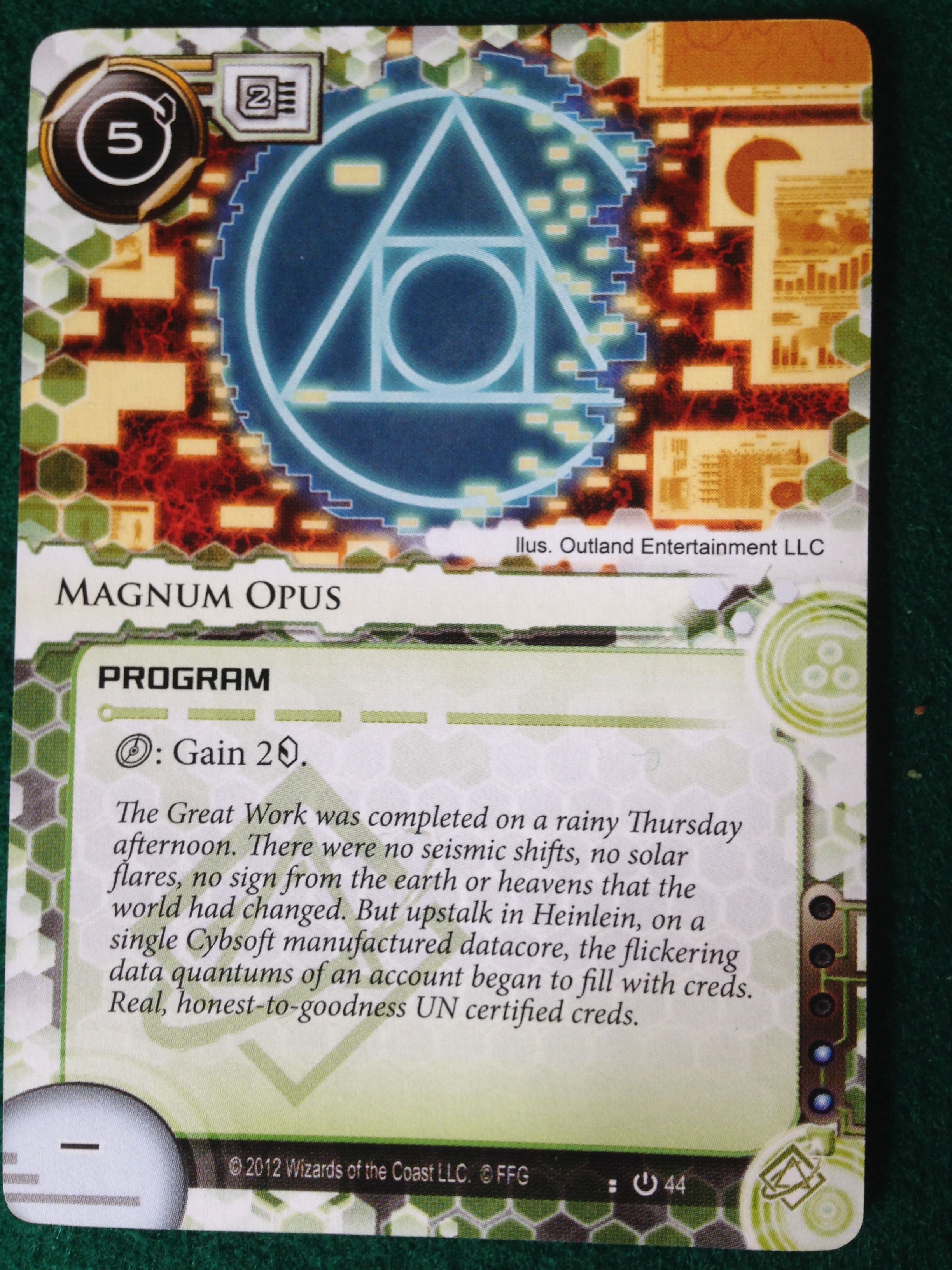 We were both OK for credits. She installed a Magnum Opus on the first turn to get a lot of money and then later trashed it to make room for icebreakers and switched to Armitage Codebusting (I love all the references in this game).