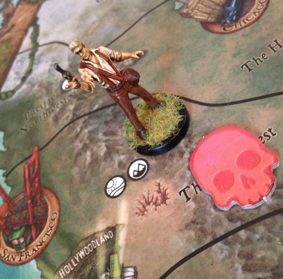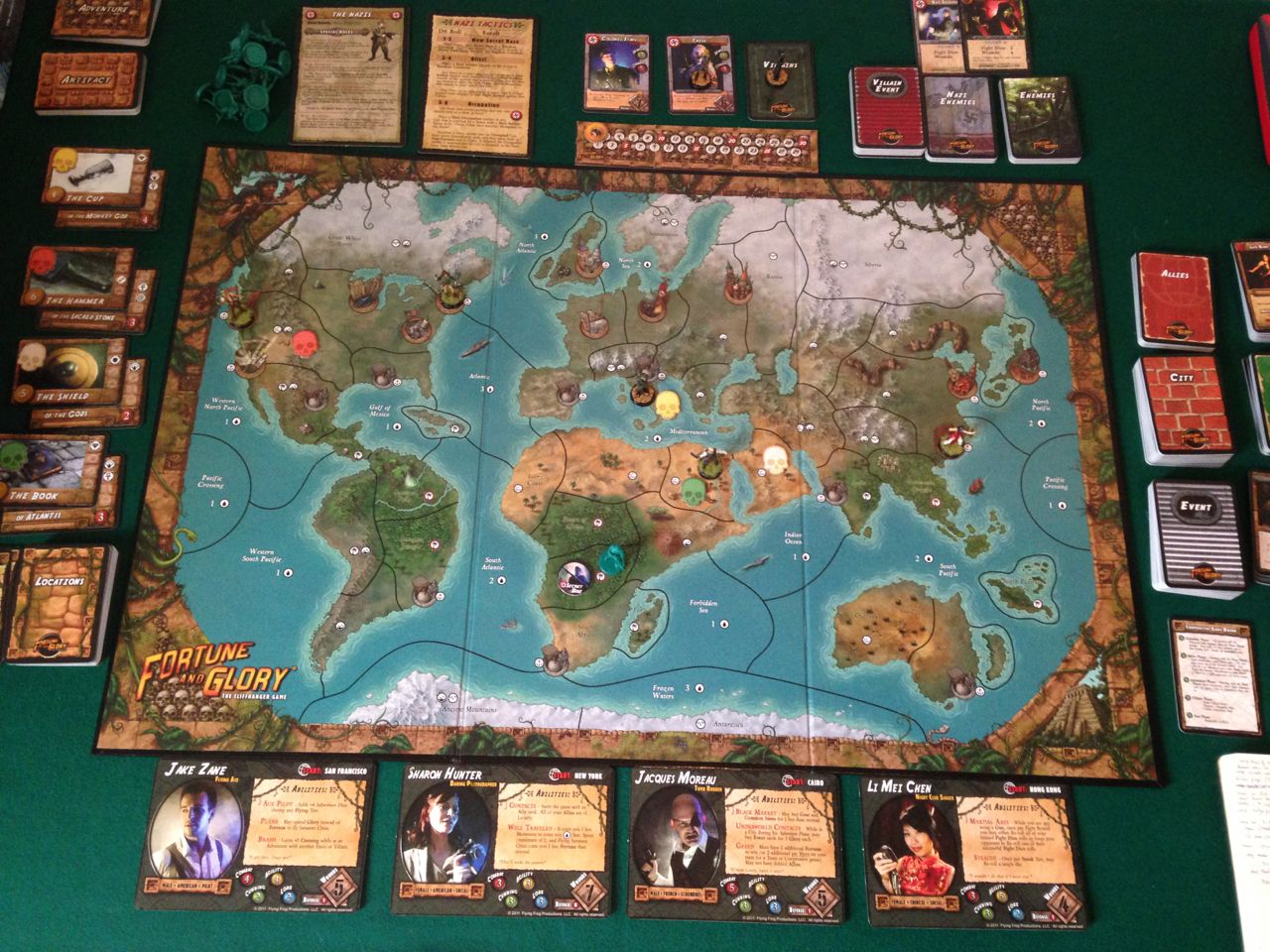 The heroes have to run around the world and beat the Nazis to the artefacts. What makes it difficult is that the heroes can be delayed by cliffhangers, and also when they do win an artefact they have to go to a city and sell it to score the fortune for it, so that is another turn to spend.
