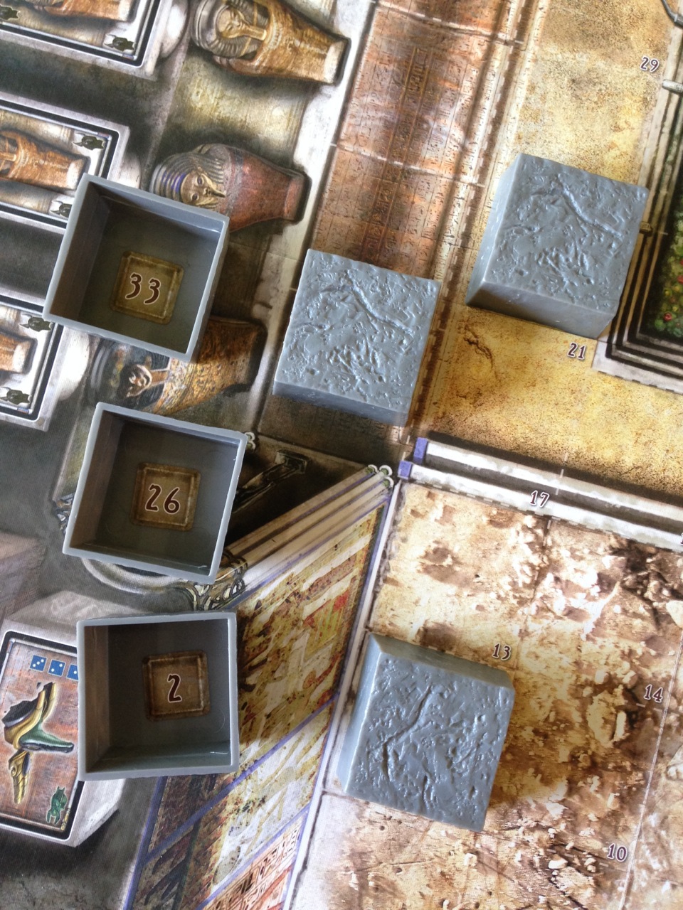 The sarcophagi always contain only treasure, but take two actions to open the lid and put you in the path of the patrolling mummies. If you get touched by a mummy too many times, you get turned into one and join them patrolling the pyramid!