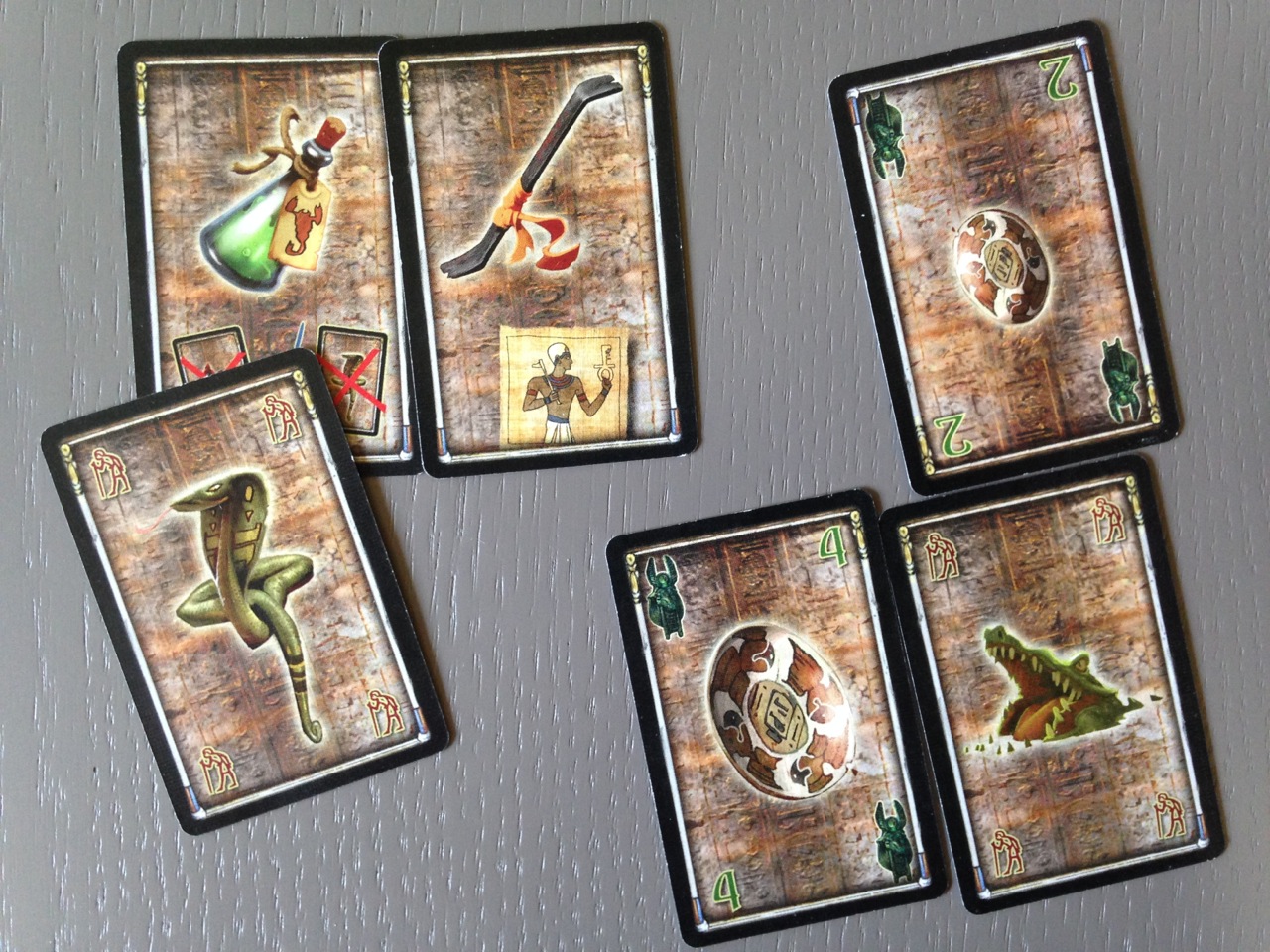 Some of the treasures and items. On the left: an antidote, a crowbar and a cobra bite! On the right: a two point treasure, a four point treasure and a crocodile bite!