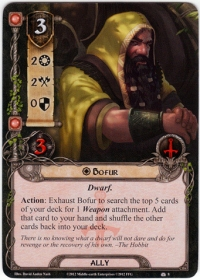 Bofur (one of the thirteen dwarves from The Hobbit) is a nice fighting ally and he has the ability to search my deck for weapons. This isn’t exactly card draw per se, but he gets cards out of my deck which is known as ‘thinning’ the deck.