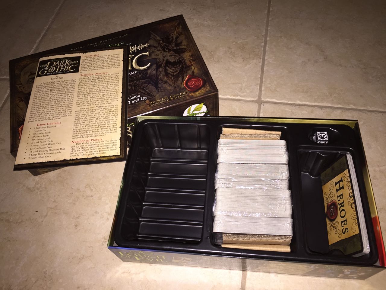 We bought a bunch of stuff, one item of which was Dark Gothic, a card game from Flying Frog, and based on their earlier game A Touch of Evil (the Spooky Hollow game). This is a deck-building card game using all the same illustrations, which is nice.