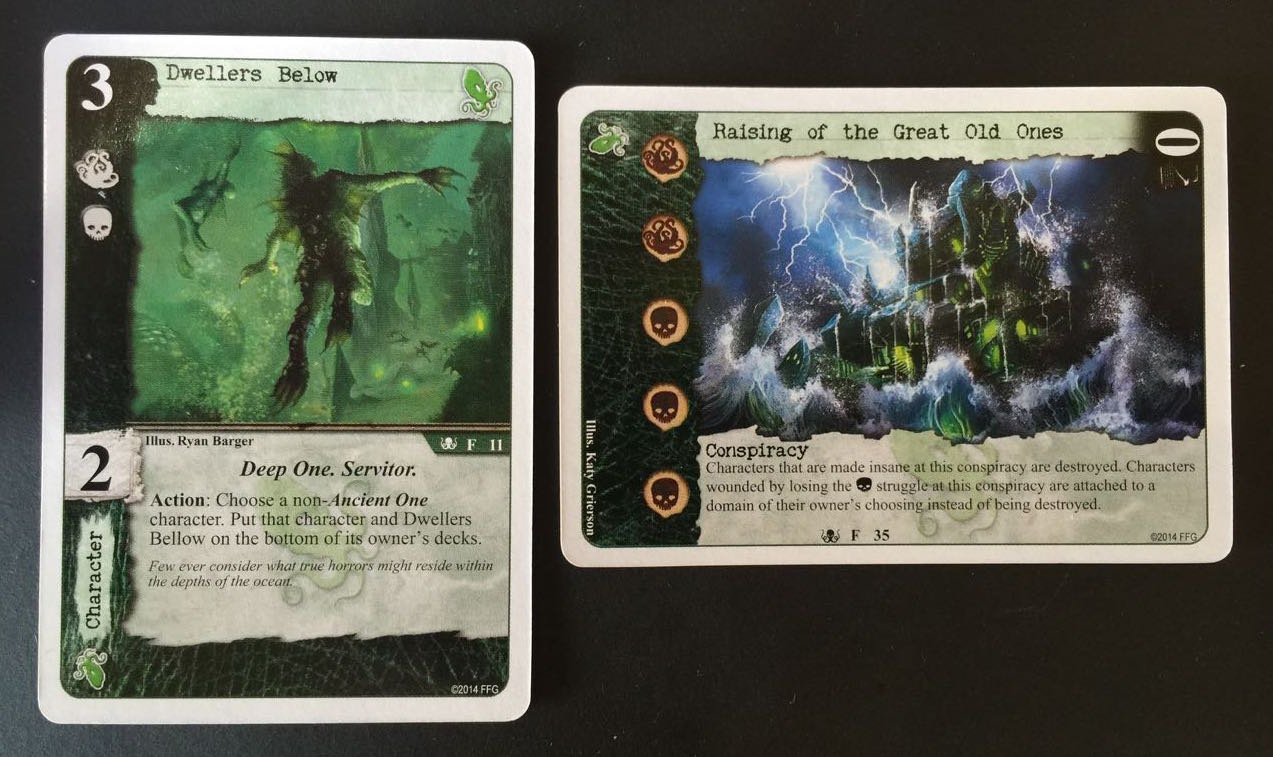 ‘The Stars Are Right’ never got used. I never had both it and a dormant character in hand at the same time. Also, it ‘puts into play’ in the same way as From the Depths. This does not trigger the characters’ regular effects from being played, such as Cthulhu’s destruction and Fiona’s success tokens. ‘Put into play’ is not the same as ‘play’ in the normal way. I had to check the FAQ for this distinction.